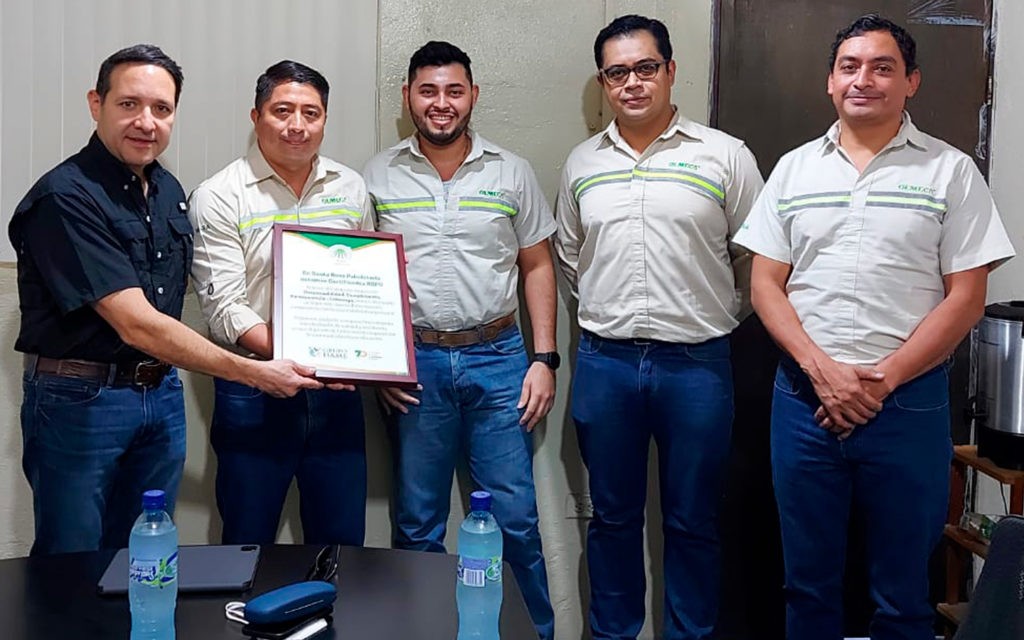At Olmeca and Santa Rosa Palmistería, HAME Group companies, we are proud to be certified since 2019 and 2020 respectively by the Roundtable on Sustainable Palm Oil (RSPO), for our Identity Preserved supply chain model. , Segregation and Mass Balance of sustainable palm oil. Fruit of teamwork Maintaining the certification has been possible thanks to the teamwork of Olmeca and Santa Rosa Palmistería, which is why the operations collaborators and corporate staff were given diplomas of recognition for the work carried out for their contribution, urging them to continue putting into practice. HAME behaviors, being responsible, accomplished, perseverant and leaders. The recognition diplomas were delivered by Felipe Molina, Group Director, representing the Board of Directors, and Irene Aycinena, Sustainability Assurance Manager. "It is important to maintain this certification, since it is a small part of our sustainability vision. We count on your commitment," emphasized Felipe Molina. With this important achievement we strengthen our business sustainability. #SomosHAME, we leave our mark, generating value.