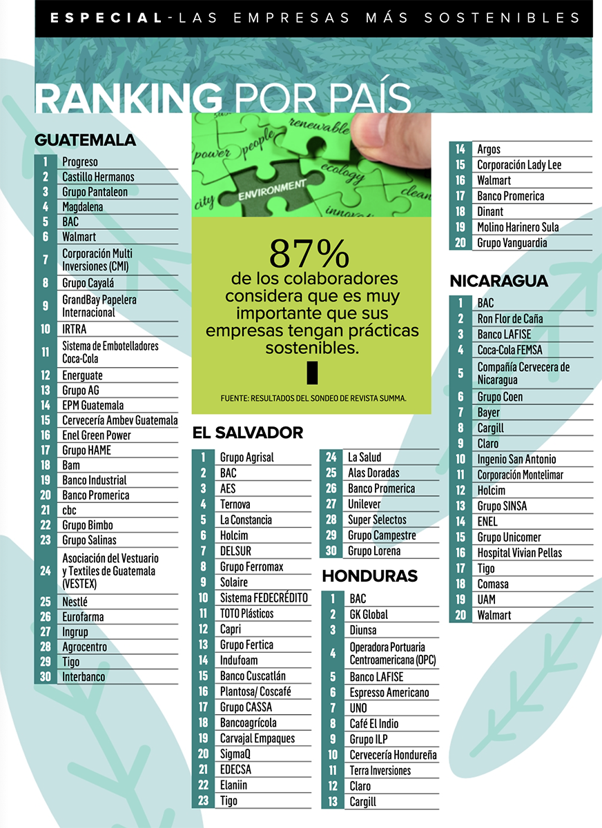 Nos enorgullece compartir que fuimos reconocidos por Revista Summa como una de las 30 empresas más sostenibles de Guatemala, ocupando el puesto número 17 en la edición 2025 de su ranking "Las empresas más sostenibles de la región". Este reconocimiento refleja la percepción positiva que líderes empresariales, altos ejecutivos y referentes de distintos sectores tienen sobre nuestro compromiso con la sostenibilidad y el desarrollo responsable.