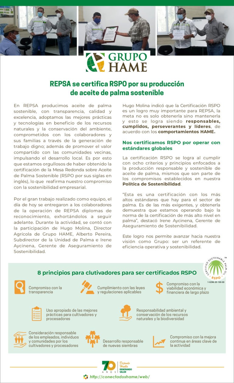 REPSA se certifica RSPO por su producción de aceite de palma sostenible